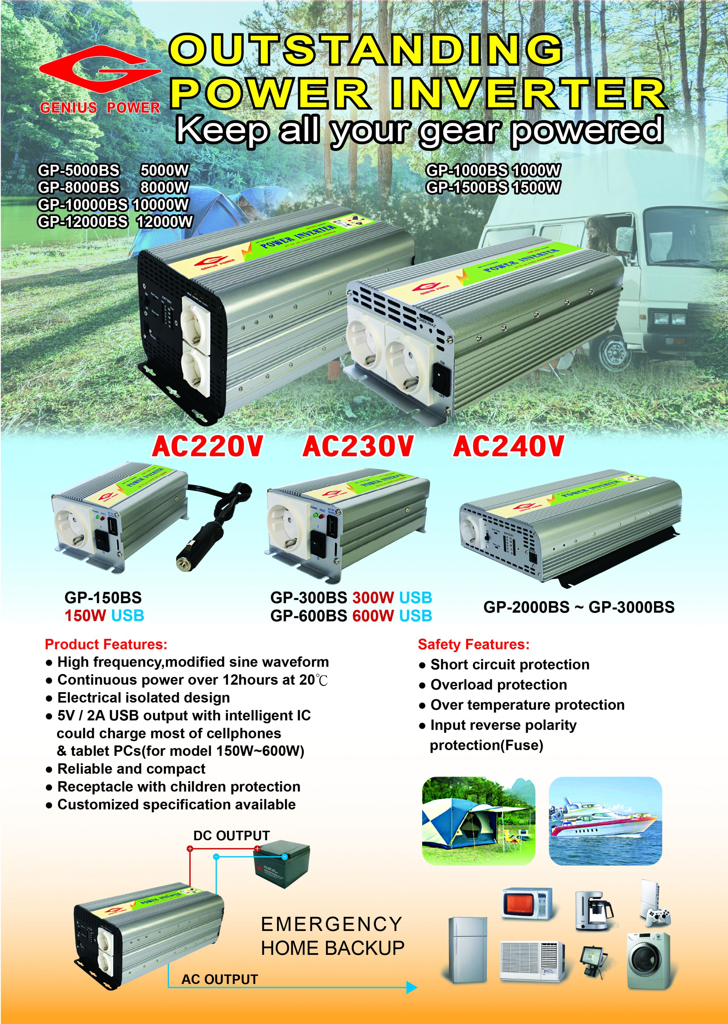 - Inverter a onda sinusoidale modificata da 150W a 12000W per backup di alimentazione AC 230V. Caratteristiche design isolato ad alta frequenza e multi-protezione per RV, campeggio e elettrodomestici.