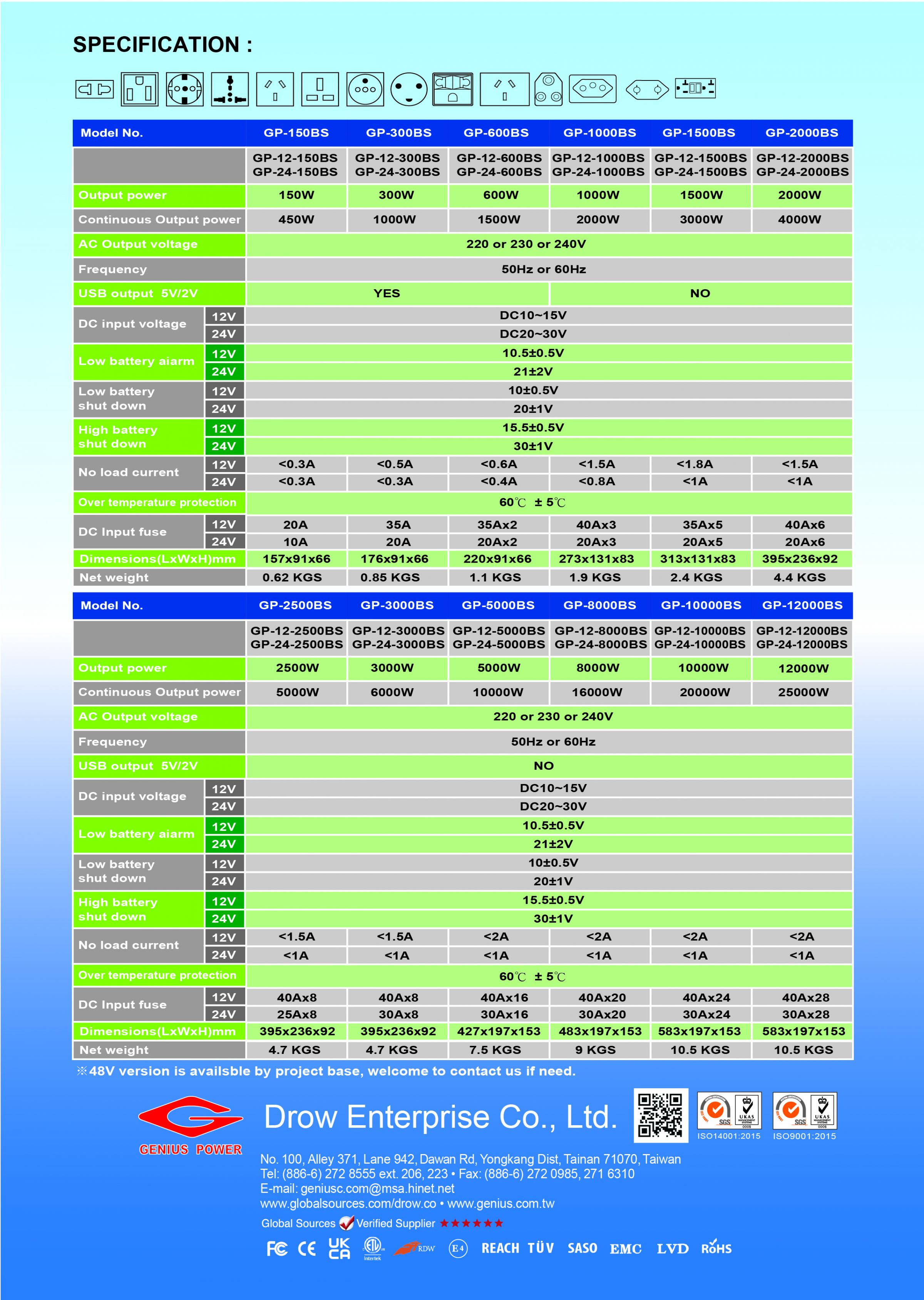 - Da 150W a 15000W: La gamma completa della serie GP di Genius power. Questa tabella tecnica dettagliata copre tutti i modelli (GP-12-150BS a GP-48-15000BS) con alta efficienza e protezione di sicurezza multi-livello.