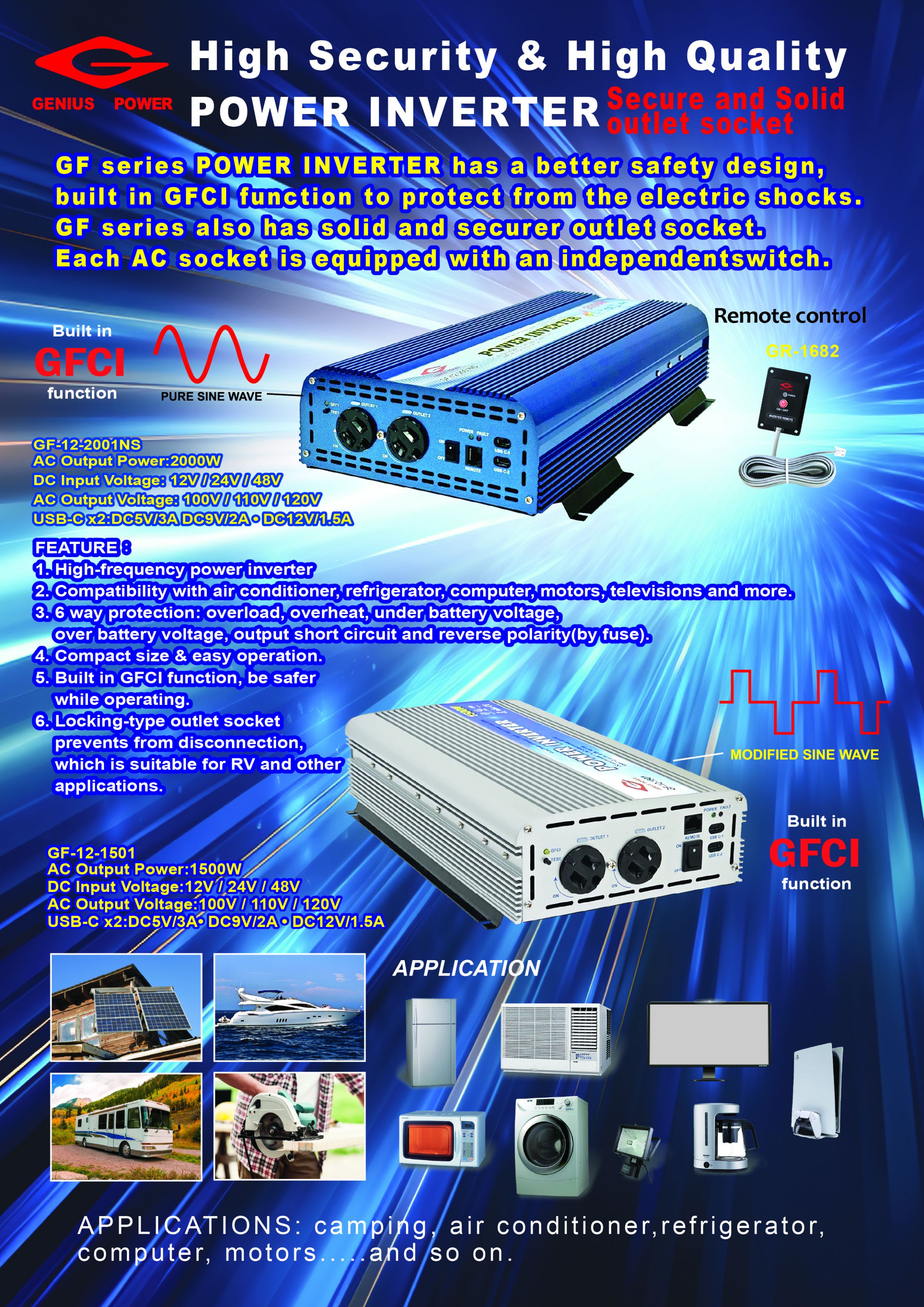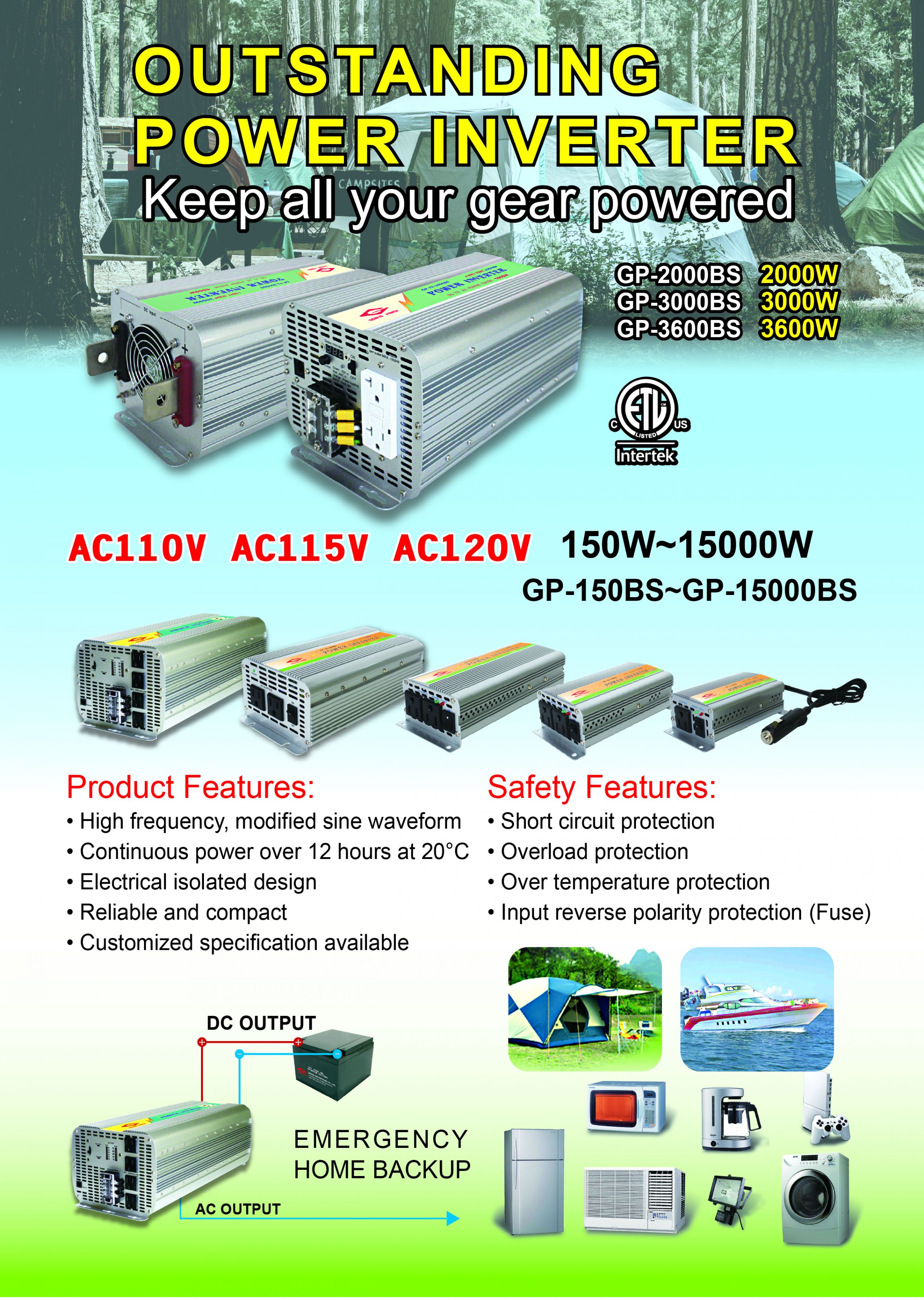 - Inverter a onda sinusoidale modificata da 150W a 15000W specifiche complete di Genius power. Dati dettagliati per la serie GP con ingresso DC 12V/24V/48V, efficienza del 90% e prese AC nordamericane.