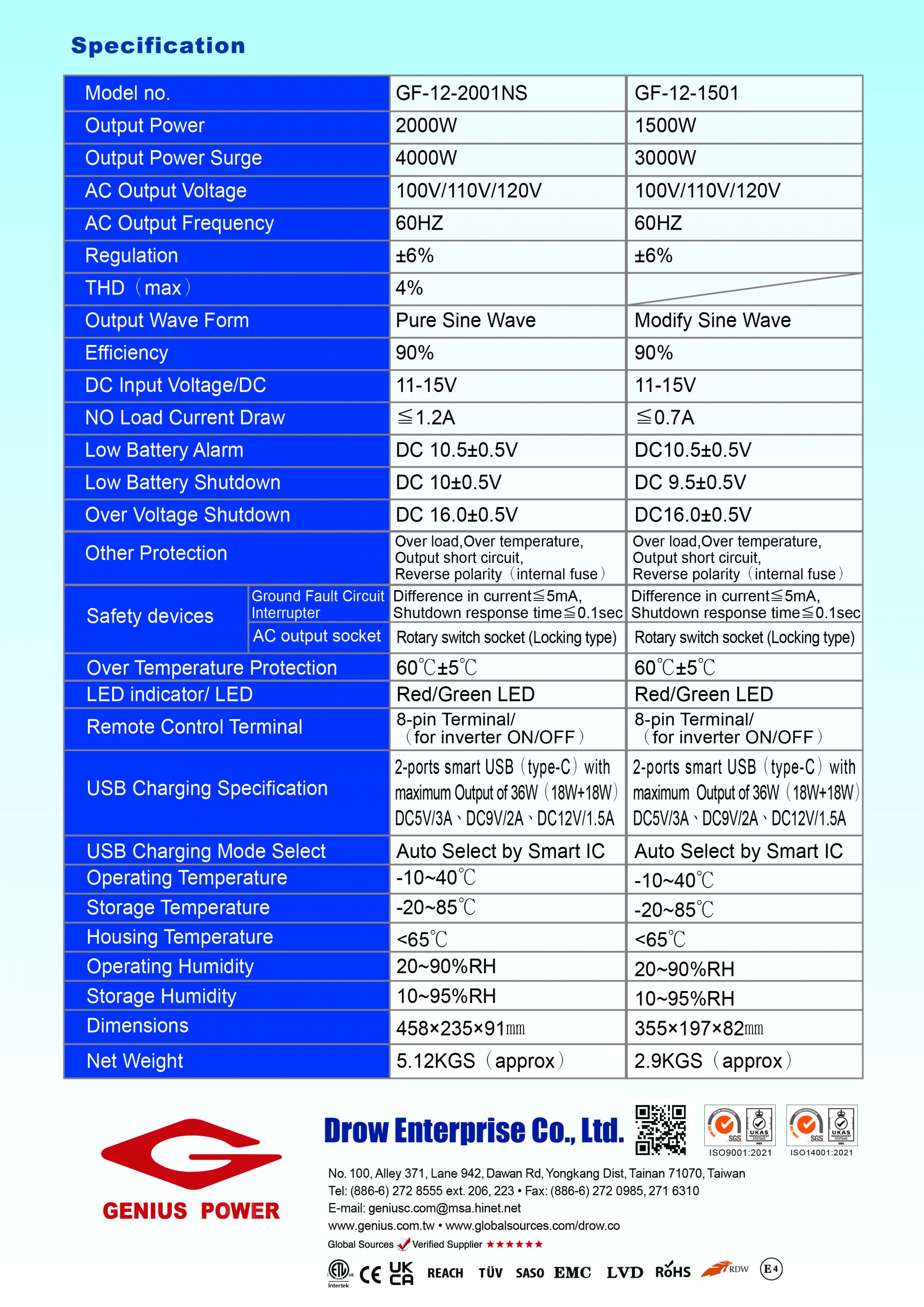 La pagina e-Catalog di Genius power funge da risorsa centralizzata per gli acquirenti che devono esaminare cataloghi scaricabili e materiali di specifica per soluzioni di potenza da DC ad AC di Drow Enterprise Co., Ltd. La pagina aiuta gli acquirenti globali a comprendere rapidamente l'ambito principale dei prodotti dell'azienda, inclusi inverter a onda sinusoidale pura, inverter a onda sinusoidale modificata, convertitori, caricabatterie per veicoli a più stadi, inverter di potenza per auto, regolatori di carica solare, stazioni di energia portatili e inverter di potenza multifunzione. Posiziona anche Genius power come un produttore con sede a Taiwan che offre produzione certificata ISO e supporto OEM/ODM per i mercati di tutto il mondo.
